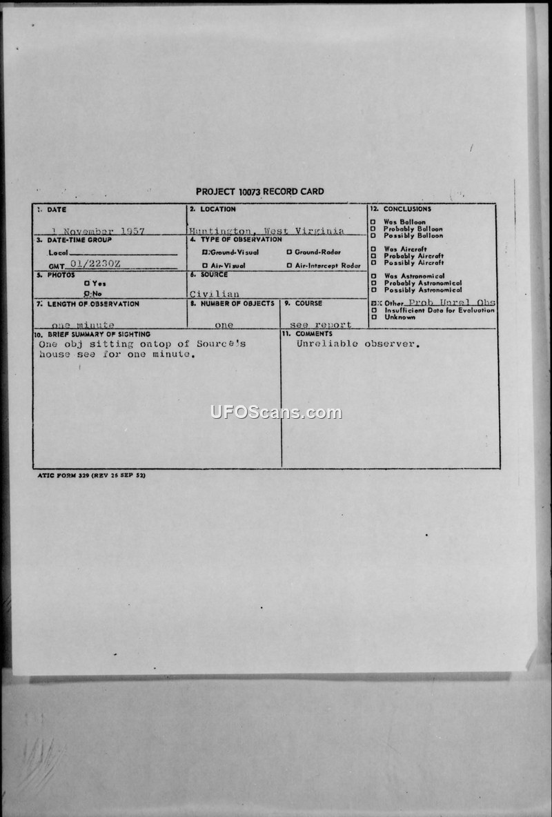 SPOT INTELLIGENCE REPORT: Unidentified Flying Object sighted at 1677 14th Avenue, Huntington, West Virginia, 1 November 1957