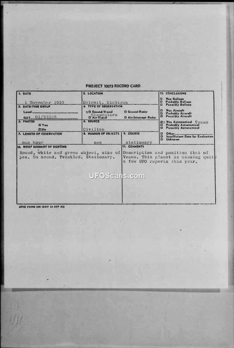 Project 10073 Record Card — Detroit, Michigan, 1 November 1957