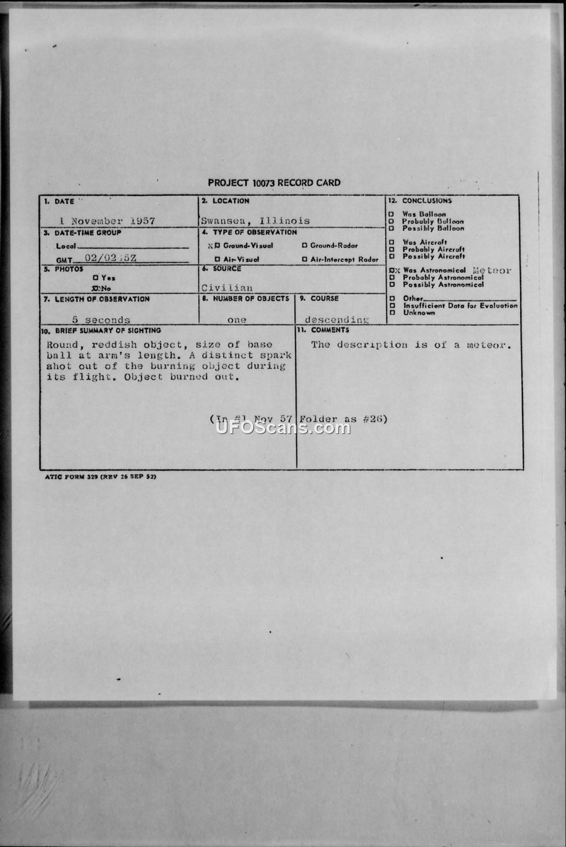 A 1957 sighting report from Swansea, Illinois, describes a round, reddish object in vertical descent that was officially concluded to be a meteor.