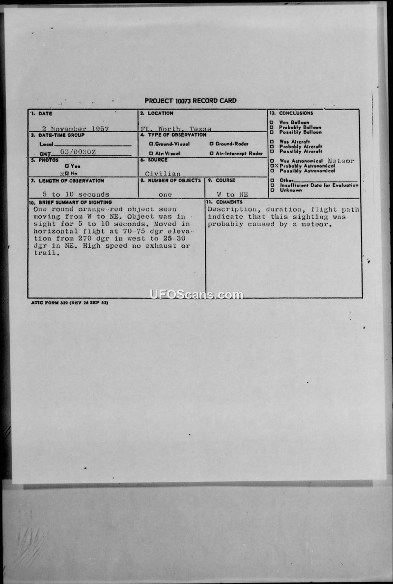 A civilian reported a round, orange-red object in the sky over Ft. Worth, Texas, on November 2, 1957. While the official record card concludes it was likely a meteor, internal ATIC notes suggest it may have been a balloon released in Mexico.