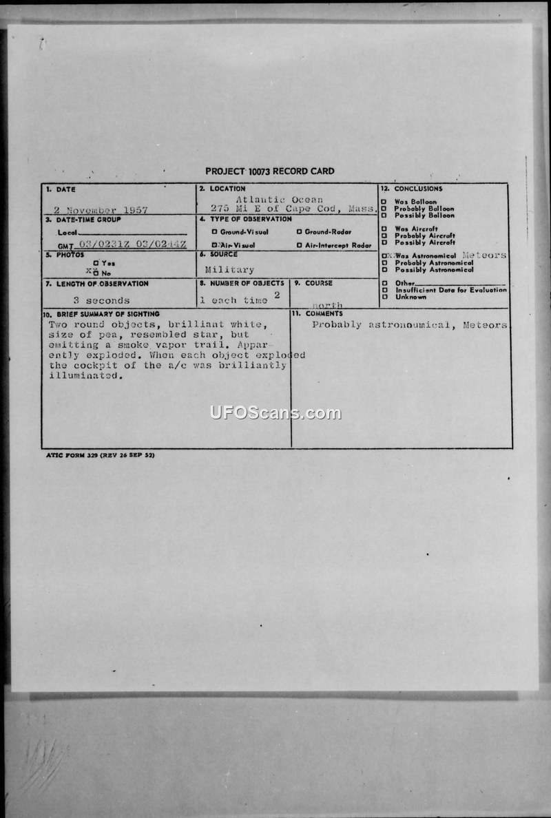 This document is a Project 10073 record card and associated teletype report detailing a sighting of two unidentified aerial objects on November 2, 1957. The incident occurred over the Atlantic Ocean, approximately 275 miles east of Cape Cod, Massachusetts. The witnesses were Captain Edward Perterson and 1st Lieutenant Gaylon Overton of the 961st AEW&CON Squadron, who were operating an RC-121 aircraft. According to the report, the two objects were observed at 0323Z and 0344Z. They were described as brilliant white, round, and approximately the size of a pea. The objects appeared to resemble stars but were distinct in that they emitted smoke or vapor trails and were traveling on a heading of approximately 340 degrees true, parallel to the aircraft's flight path. The report explicitly states that both objects exploded, and that during these explosions, the cockpit of the aircraft was brilliantly illuminated. The crew noted that the phenomenon was different from any falling star or comet they had observed on numerous previous occasions. The official conclusion recorded on the card is 'Probably astronomical, Meteors.' However, the documentation includes a handwritten note next to the mention of the smoke/vapor trail, stating, 'Note: Suggestive to a combustion engine.' The report was submitted in accordance with Air Force Regulation 200-2 and was evaluated by the Air Technical Intelligence Center (ATIC). The document provides technical details regarding the aircraft's flight, including its altitude of 'Angels 5' (5,000 feet) and speed of 240 knots, as well as meteorological conditions, which included an undercast and overcast skies.