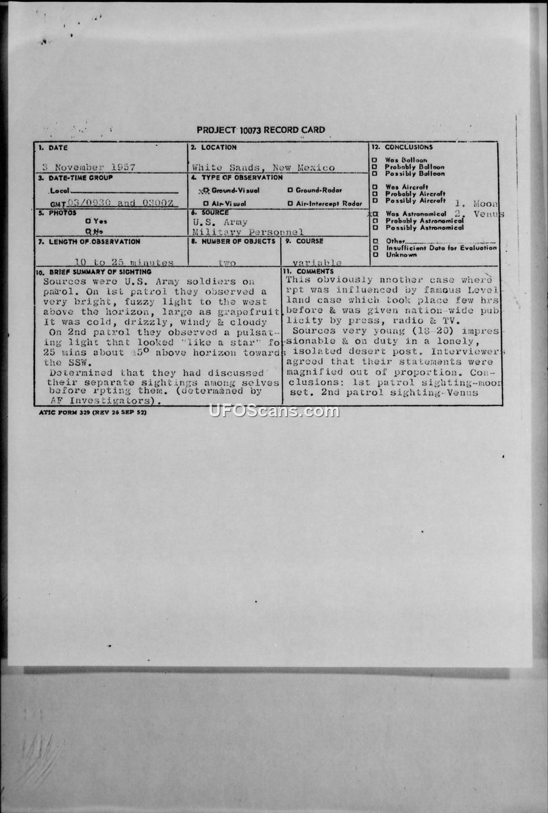 Military police at White Sands Proving Grounds reported two UFO sightings on 3 November 1957. Air Force investigators concluded the sightings were misidentifications of the moon and the planet Venus.