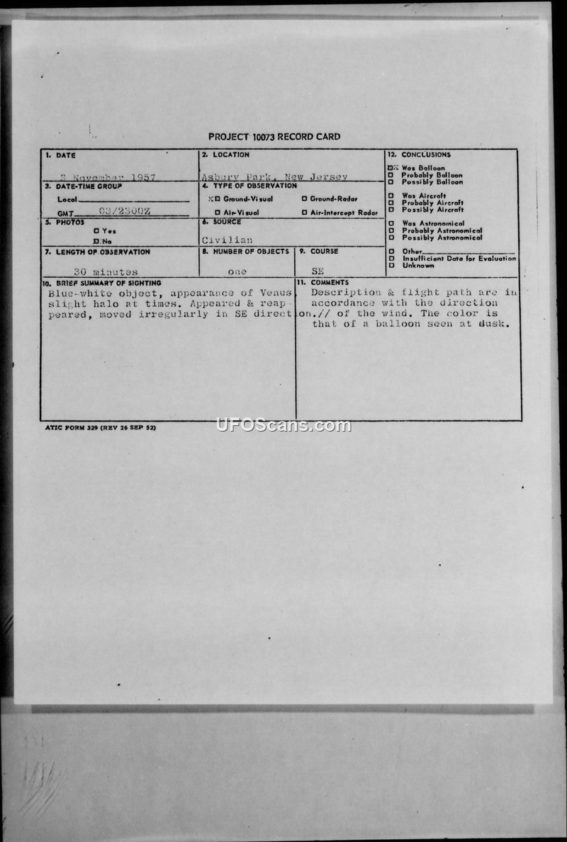 This document contains two Project 10073 record cards and associated teletype reports regarding UFO sightings in Asbury Park, New Jersey, in November 1957. The first incident occurred on November 3, 1957, involving a blue-white object that appeared to have a slight halo and moved irregularly in a southeasterly direction for approximately 30 minutes. The observer, a civilian employee at the Signal Equipment Support Agency at Fort Monmouth, described the object as similar to Venus. Military intelligence concluded that the description and flight path were consistent with a balloon seen at dusk, noting the correlation with wind directions. The second incident occurred on November 7, 1957, involving a white object described as the size of a dime and resembling a large star. This object was observed for six minutes before disappearing, leaving a vapor trail. The observers, a civilian and his wife, were located in a heavily traveled airway. Intelligence analysts concluded that this object was likely an aircraft, noting that the vapor trail was suggestive of a combustion engine. Both reports were processed through the 26th Air Division and forwarded to ATIC and HQ USAF for evaluation. The documents reflect the standard military procedure for documenting and assessing civilian reports of unidentified aerial phenomena during this period, emphasizing the identification of conventional explanations such as balloons and aircraft.