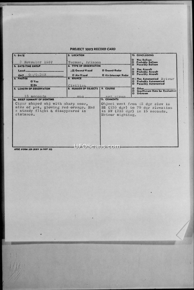 Project 10073 Record Card and Incident Report — Tucson, Arizona, 3 November 1957