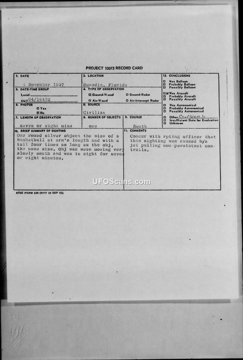 This document is a collection of reports and records concerning Unidentified Aerial Phenomena (UAP) sightings occurring in early November 1957. The primary record is a Project 10073 card documenting a sighting in Dunedin, Florida, on November 4, 1957. A civilian witness reported observing a round, silver object, approximately the size of a basketball at arm's length, with a tail four times its length. The object moved slowly south for seven to eight minutes. The official conclusion recorded on the card is that the sighting was caused by a jet aircraft leaving non-persistent contrails. The document also includes teletype communications and press clippings regarding separate, concurrent sightings at the White Sands Proving Grounds in New Mexico. These reports describe two military police patrols observing a 'very bright' object near the Trinity Site, the location of the first atomic bomb explosion. Descriptions of these objects varied, with some reports mentioning a cigar-shaped object 200 feet long, while others described an egg-shaped object. Military personnel at White Sands reported the object hovered or touched down briefly. Dr. Lincoln La Paz, a meteoriticist at the University of New Mexico, is quoted in the press clippings as stating that the objects were likely man-made or attributable to meteoritic phenomena, dismissing theories of extraterrestrial origin. The document highlights a discrepancy between official Air Force explanations—which suggested the planet Venus or cloud formations—and the reports provided by the military patrols on the ground. The file includes technical details such as radar unit responses, weather conditions, and the specific observations of the witnesses involved in the various incidents.
