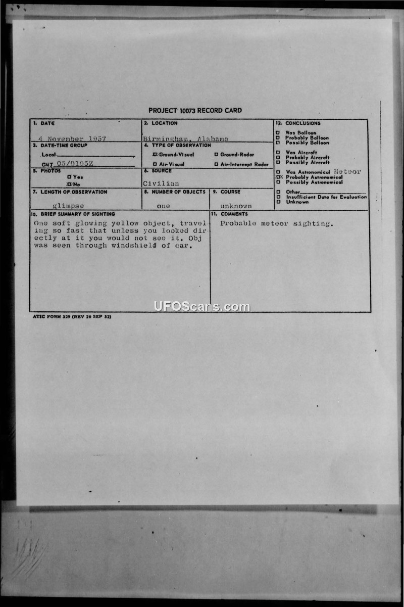 A 1957 sighting report from Birmingham, Alabama, describes a fast-moving yellow object seen by a driver. Military investigators concluded it was likely a meteor or a reflection of a traffic light on the windshield.