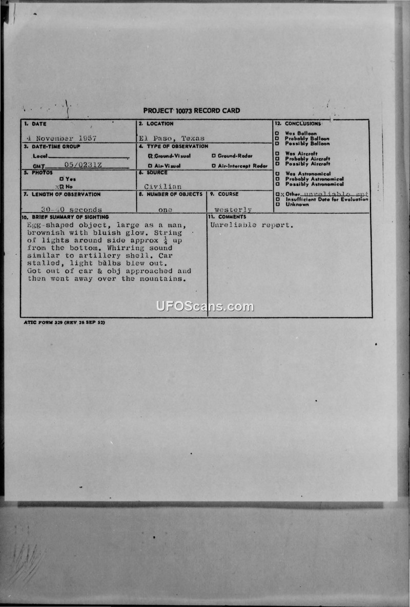 This document contains two separate Project 10073 record cards and associated military teletype reports regarding Unidentified Aerial Phenomena (UAP) sightings near El Paso, Texas, in November 1957. The first incident, occurring on 4 November 1957, involved a Border Inspector who reported an egg-shaped object, approximately the size of a man, with a brownish color and a bluish glow. The witness described a string of lights around the object's side and reported that the object approached him while emitting a whirring sound similar to an artillery shell. Notably, the witness claimed that his car stalled and the light bulbs blew out during the encounter. The object eventually departed over the mountains. Military intelligence officers at the 95th Bomb Wing provided no explanation for this event, though handwritten annotations on the report suggest it may have been a balloon, noting that the report surfaced shortly after press coverage of other incidents in the region. The second incident, reported on 7 November 1957, involved two witnesses who observed a circular object that appeared to be the size of a fifty-cent piece at arm's length. The object was described as white, changing to red and green, and was observed for 5 to 6 seconds before fading over the horizon. Lt. Robert W. Debolt of the 685th ACWRON evaluated this second report, concluding that the object was very possibly an aircraft in the El Paso area and suggesting that the red and green lights were standard navigational lights. The documents reflect the standard military procedure for reporting and evaluating UAP sightings during this period, including the use of standardized record cards and teletype communications between various Air Defense Command units.