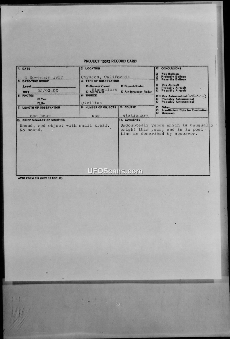 A civilian in Cayucos, California, reported a stationary, red, elliptical object on 4 November 1957. The Air Force investigation concluded the object was the planet Venus.