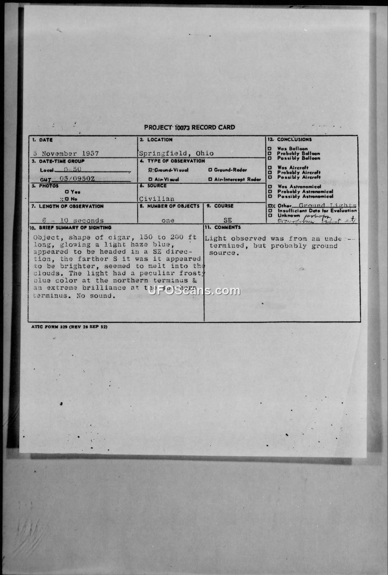 Project 10073 Record Card — Springfield, Ohio, 5 November 1957