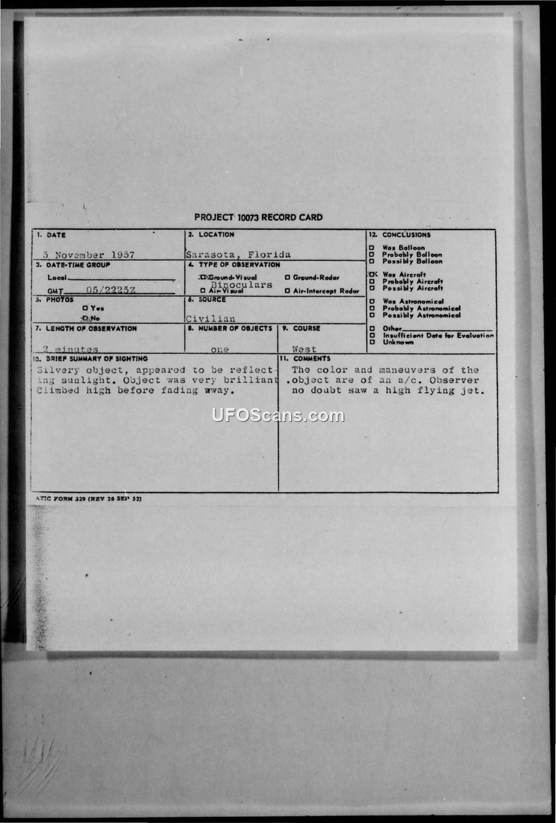 Project 10073 Record Card — Sarasota, Florida, 5 November 1957