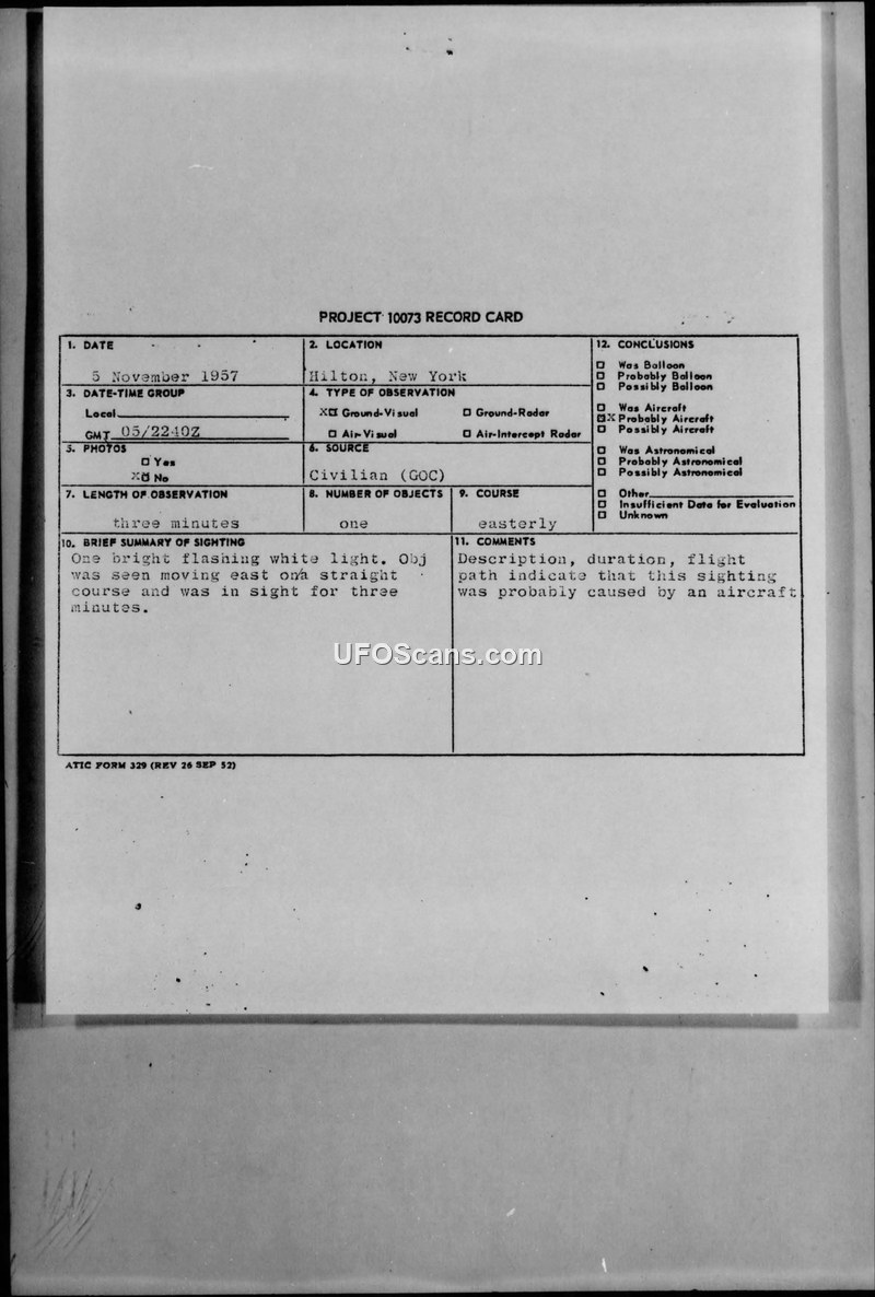 A GOC observer in Hilton, New York, reported a bright, flashing white light on 5 November 1957. Military authorities concluded the object was likely an aircraft in the Rochester landing pattern.