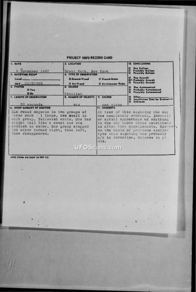 A 15-year-old witness reported six round objects in Great Neck, NY, on November 5, 1957. ATIC officials concluded the objects were likely aircraft in formation despite the overcast conditions.