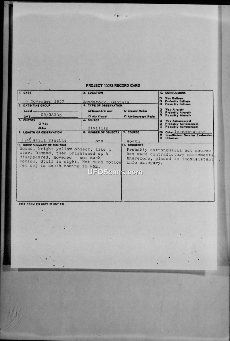 PROJECT 10073 RECORD CARD — Woodstock, Georgia, 5 November 1957