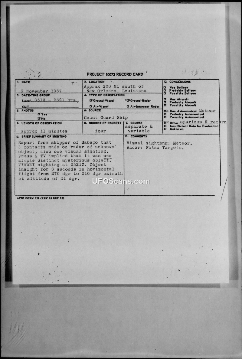 On 5 November 1957, the Coast Guard Cutter Sebago, located approximately 200 miles south of New Orleans, reported a series of radar and visual contacts. The initial report indicated that the ship's radar picked up an unknown object at 0510Z, followed by three subsequent radar contacts over a period of approximately six minutes. The radar contacts were erratic, with targets appearing in opposite directions and at considerable distances from one another. A single visual sighting occurred at 0521Z, during which an object resembling a brilliant planet was observed for three seconds, moving in a horizontal direction from south to north. The crew initially reported these events as a single mysterious object, a narrative that was subsequently picked up by the press and television. However, internal military evaluations, including those from the Foreign Technology Division, concluded that the impression of a single object was erroneous. The radar contacts were attributed to anomalous propagation, or 'false targets,' while the visual sighting was determined to be a meteor. The Foreign Technology Division further noted that while some radar speeds were compatible with aircraft, the erratic nature of the signals and the short duration of the contacts strongly suggested atmospheric or electronic phenomena rather than a physical craft. The documentation includes a Project 10073 record card, a detailed narrative of the radar contacts, and a 1963 evaluation by the Foreign Technology Division confirming the assessment of false radar targets and a meteor.
