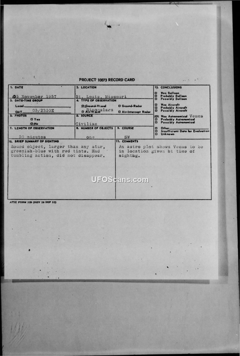 This document collection consists of Project 10073 record cards and associated military teletype correspondence regarding UFO sightings in the St. Louis, Missouri area during November 1957. The reports detail three distinct incidents. The first, occurring on November 5, 1957, involved a report of a round, greenish-blue object with red tints that appeared larger than a star and exhibited a tumbling motion. This was observed for 50 minutes. Official analysis concluded this was the planet Venus, as an astronomical plot confirmed its location at the time of the sighting. The second and third incidents, reported on November 9 and 10, 1957, involved objects described as resembling jet aircraft or meteors. One witness reported a long, white object that appeared to burn out, while another described a long, white, low-overhead object. These sightings were investigated by the 798th ACWRON and the 20th Air Division. Military investigators, including 1/Lt James S. Prowell, noted that there were jet fighter operations in the area at the time of the sightings. The final ATIC conclusions for these reports indicate that the sightings were likely jet aircraft, specifically F-100 series, conducting test runs. The investigators emphasized that jet aircraft at night, particularly at high altitudes, can easily be mistaken for meteors. The documentation includes standard record cards, teletype messages between military units, and handwritten notes from investigators evaluating the reports. The overall assessment by ATIC was that the reports were 'skimpy' and lacked specific data, but that the available evidence pointed toward conventional aircraft rather than unidentified aerial phenomena.