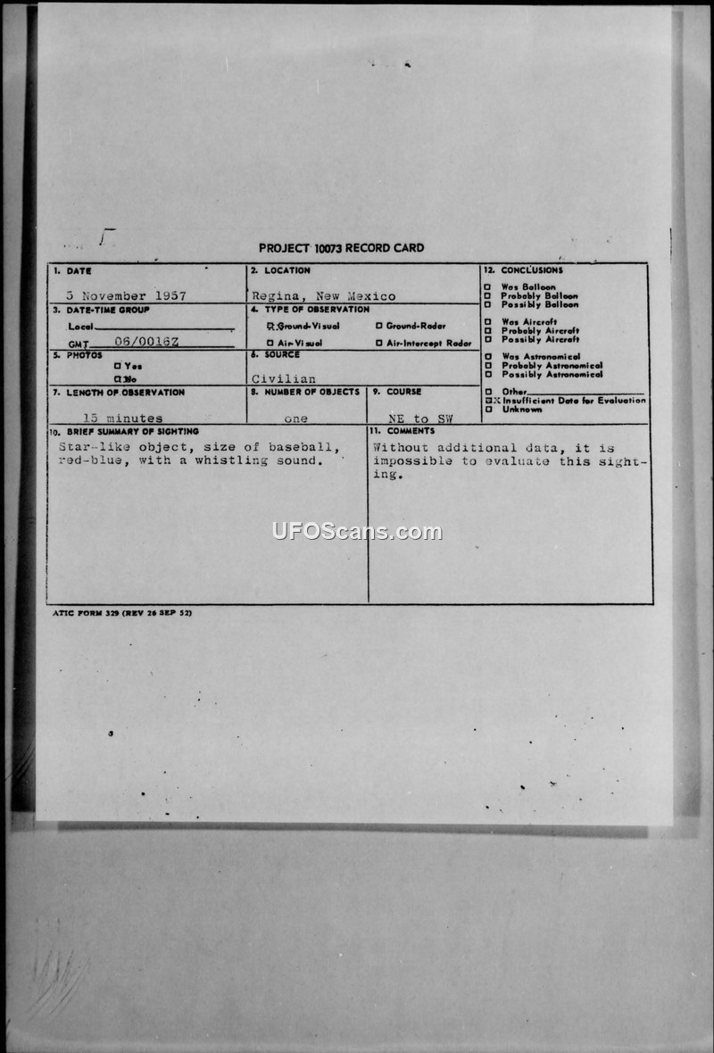 Project 10073 Record Card — Regina, New Mexico, 5 November 1957
