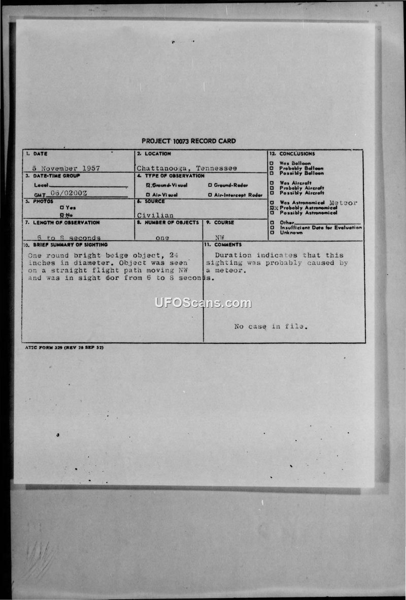 Three Project 10073 record cards from Chattanooga, Tennessee, documenting UAP sightings between 1957 and 1963. The sightings were attributed to either meteors or aircraft.
