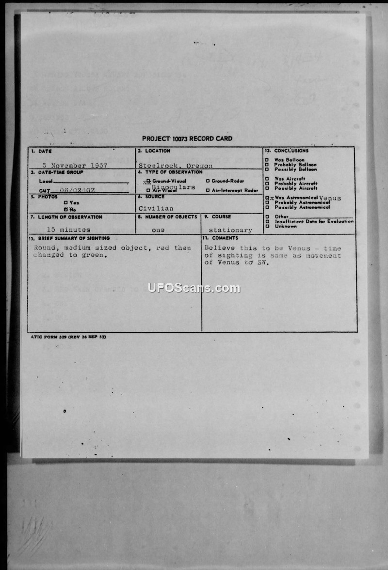 Project 10073 Record Card — Steelrock, Oregon, 5 November 1957