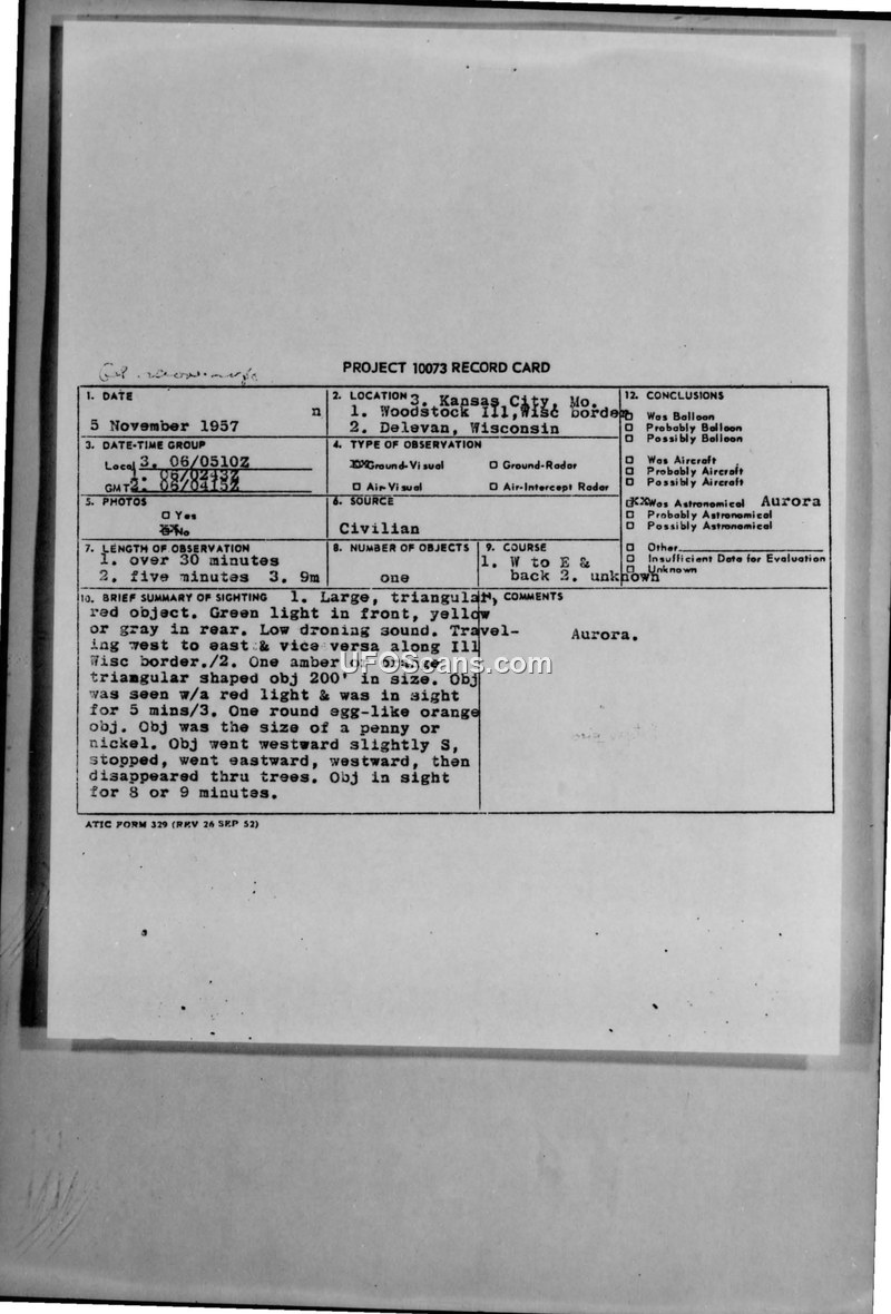 This document is a collection of reports and record cards compiled under Project 10073 regarding a series of sightings on November 5, 1957, in the Midwest United States, specifically near the Illinois-Wisconsin border and Galesburg, Illinois. The primary incident involves a civilian witness who reported a large, triangular, red object with a green light in front and a yellow or gray rear. The object reportedly emitted a low droning sound and was observed for approximately eight to nine minutes, moving between west and east before disappearing through trees. The witness also reported a pungent odor, which investigators suggested might have been of local origin, such as a hot engine or an arc welder. Other reports included in the file describe similar sightings in Galesburg and near Spooner, Wisconsin, where witnesses described oval or egg-shaped objects. The official conclusion reached by the Air Technical Intelligence Center (ATIC) was that the phenomena were likely auroras. The documentation includes internal military communications, record cards, and press clippings, reflecting the military's effort to categorize these sightings. The reports were processed through the 755th ACWRON and forwarded to the Air Intelligence Center and other command units. The documentation also notes that the witness's description of the object's shape and lights could be interpreted as an F-100 series aircraft, particularly given the location near an active airway.