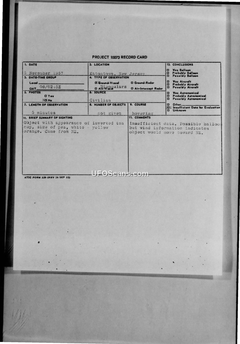 This collection of documents details two UFO sighting reports occurring in November 1957 near Eatontown, New Jersey. The primary witness, a civil service employee at the U.S. Signal Corps at Fort Monmouth, reported observing an object described as an 'inverted tea cup' the size of a pea. On 6 November 1957, the object was observed hovering for approximately five minutes before moving straight up. The object was described as white, yellow, and orange. A subsequent report on 27 November 1957 involved a similar object, described as elongated and bright red, which also exhibited a vapor trail and an orange halo. The witness for the second event was also a civil service employee at the same location. Military intelligence and the Air Technical Intelligence Center (ATIC) evaluated these reports. The official conclusion for both incidents was that the objects were likely helicopters, possibly originating from the nearby Fort Monmouth facility. The reports include detailed meteorological data, including wind speeds at various altitudes, and note that the sightings occurred during clear nights with good visibility. The documents contain internal correspondence between various military commands, including the 26th Air Division and the Air Defense Command, regarding the transmission and analysis of these reports. The records emphasize that the descriptions provided by the witnesses were consistent with the appearance of a helicopter at high altitude, particularly under lighting conditions that might cause visual distortion. The files include sketches and notes from investigators who concurred with the assessment that the sightings were not of an anomalous nature.