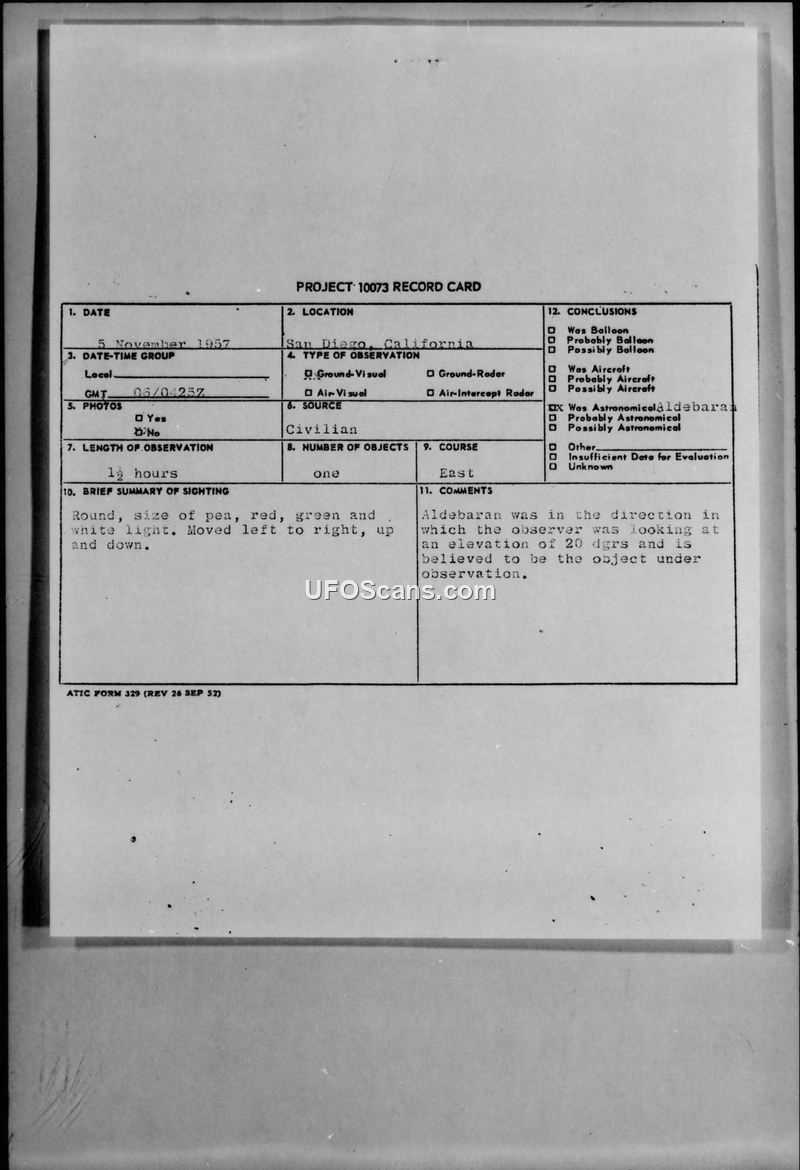A civilian report of a multi-colored light in San Diego was investigated by the Air Technical Intelligence Center. The object was officially identified as the star Aldebaran.