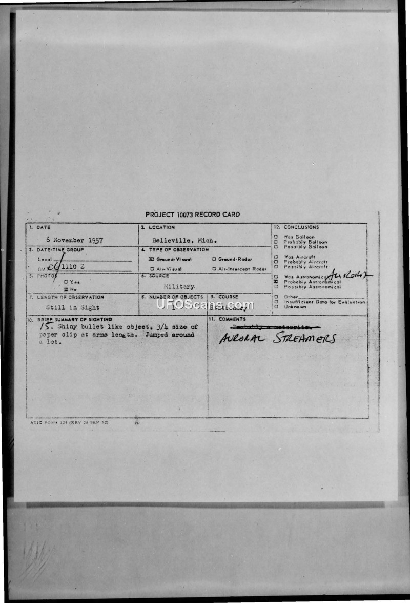 This document is a Project 10073 Record Card documenting a sighting that occurred on 6 November 1957 in Belleville, Michigan. The observer reported seeing a single, shiny, bullet-like object. The witness described the size of the object as being approximately three-quarters the size of a paper clip held at arm's length. The object was noted to have 'jumped around' and remained in sight for an unspecified duration. The report indicates that the observation was made by military personnel. The record card includes handwritten annotations in the comments section, where initial thoughts of the object being a meteorite or 'AURORAL STREAMERS' were crossed out. The final conclusion marked on the card is 'Probably Astronomical'. No photographic evidence or radar contact was associated with this sighting.