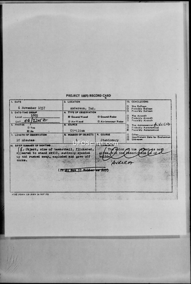 Project 10073 Record Card — Anderson, Ind., 6 November 1957