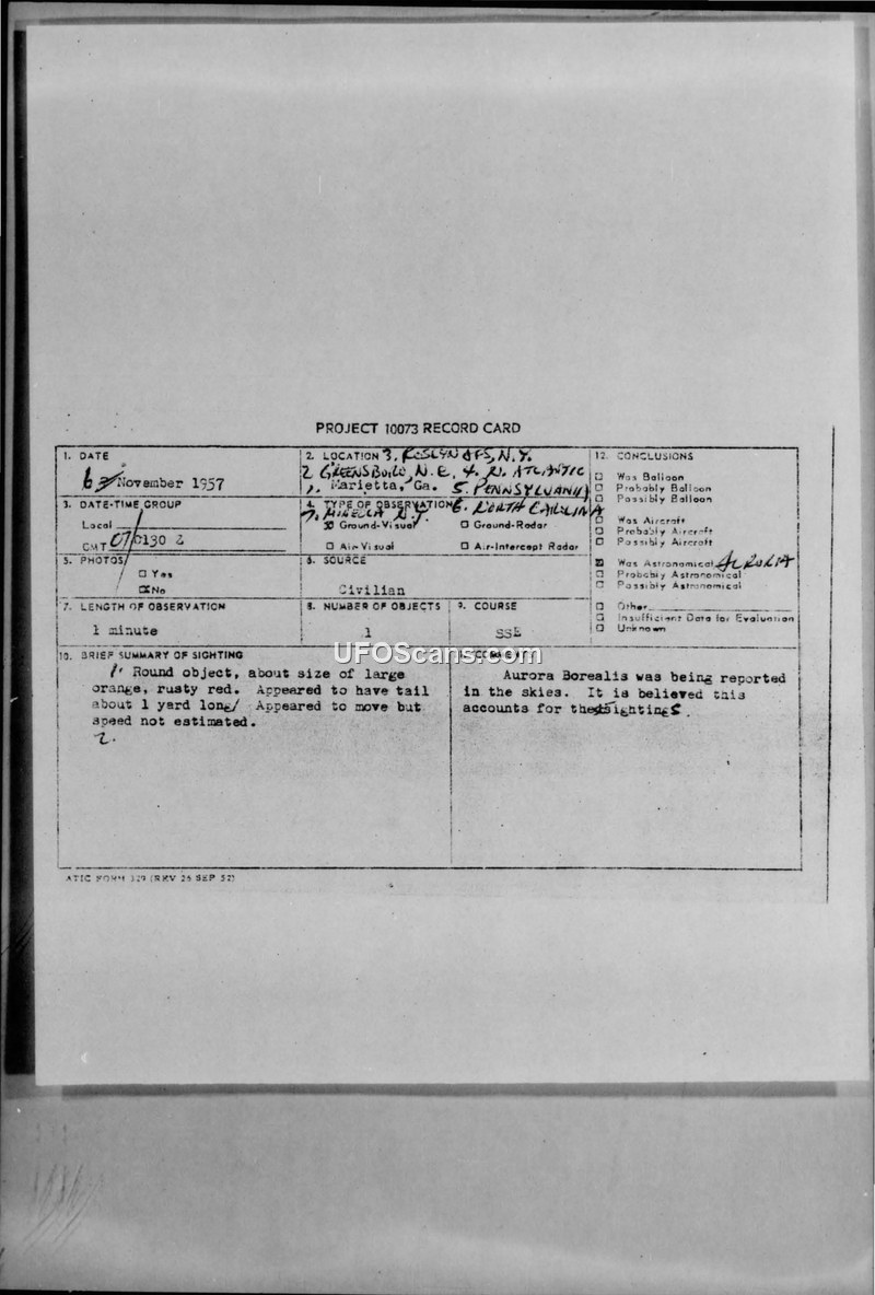 This document is a compilation of Project 10073 record cards and associated military message forms documenting numerous reports of unidentified aerial phenomena (UAP) across the United States during November 1957. The reports originate from various civilian and military sources, including Coast Guard stations and commercial airline pilots. The descriptions provided by witnesses are highly varied, ranging from 'round, rusty red objects' to 'white lights' and 'large gray masses.' Many reports describe objects with tails, oscillating lights, or specific colors like red and green. The military response, primarily coordinated through the Air Technical Intelligence Center (ATIC) and various Air Defense Command (ADC) units, consistently emphasizes the need for more precise data, such as elevation, azimuth, and flight path, which were frequently missing from the initial reports. A recurring theme throughout the documentation is the identification of the Aurora Borealis as a primary explanation for these sightings. Military controllers and intelligence officers frequently noted that the Aurora Borealis was 'very prominent' during this period and that many observers, unfamiliar with the phenomenon, likely misidentified it. Several reports were marked as 'insufficient data' due to the lack of descriptive detail, and in some instances, investigators suggested that sightings might have been misidentified aircraft or astronomical events. The document reflects the rigorous, albeit often frustrated, efforts of the Air Force to categorize these reports within the framework of existing regulations, such as AFR 200-2. The correspondence highlights the challenges of distinguishing between genuine anomalous phenomena and natural occurrences like the Aurora Borealis, especially when observers provided poor or inconsistent descriptions. The collection serves as a snapshot of the UAP reporting process in the late 1950s, illustrating the reliance on civilian reports and the subsequent attempts by military intelligence to provide rational, often astronomical, explanations.