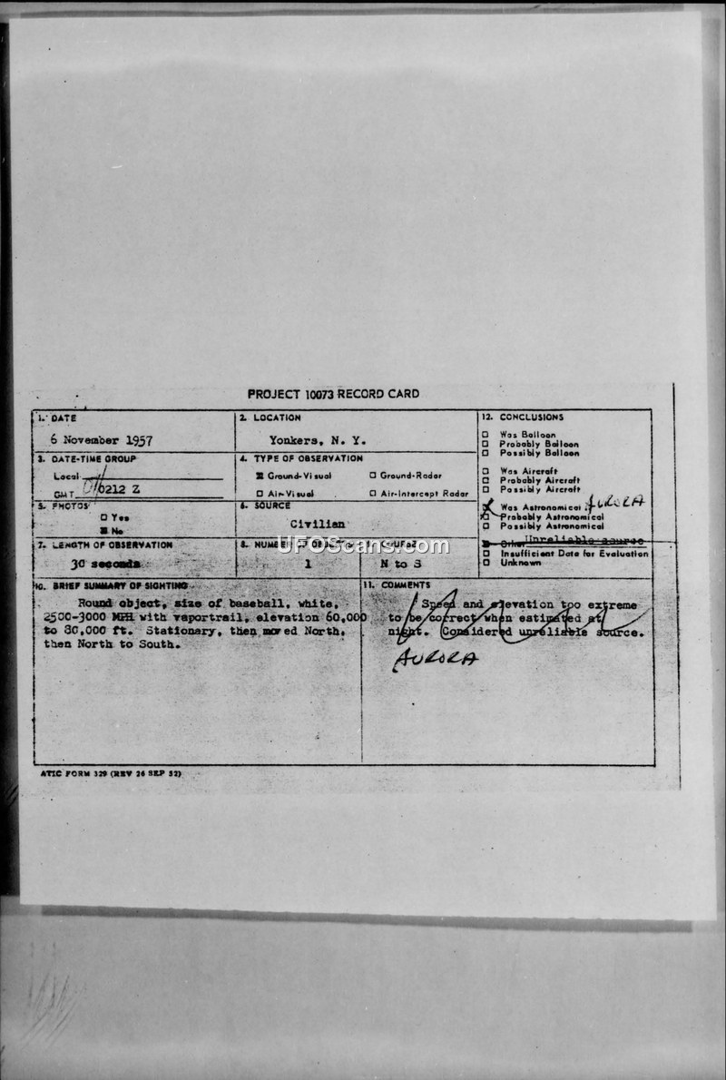 Project 10073 Record Card — Yonkers, N. Y., 6 November 1957
