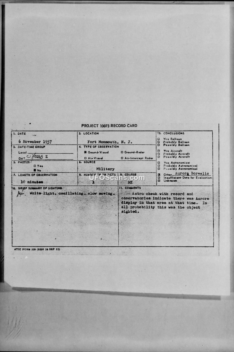 A Project 10073 record card documenting a 10-minute sighting of a white, oscillating light at Fort Monmouth, NJ, on 6 November 1957. The event was officially attributed to an Aurora Borealis display.