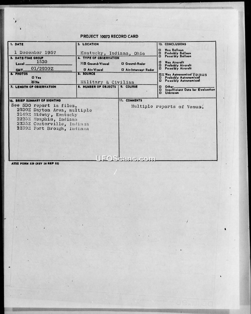 Project 10073 Record Card: Sighting Report 1 December 1957