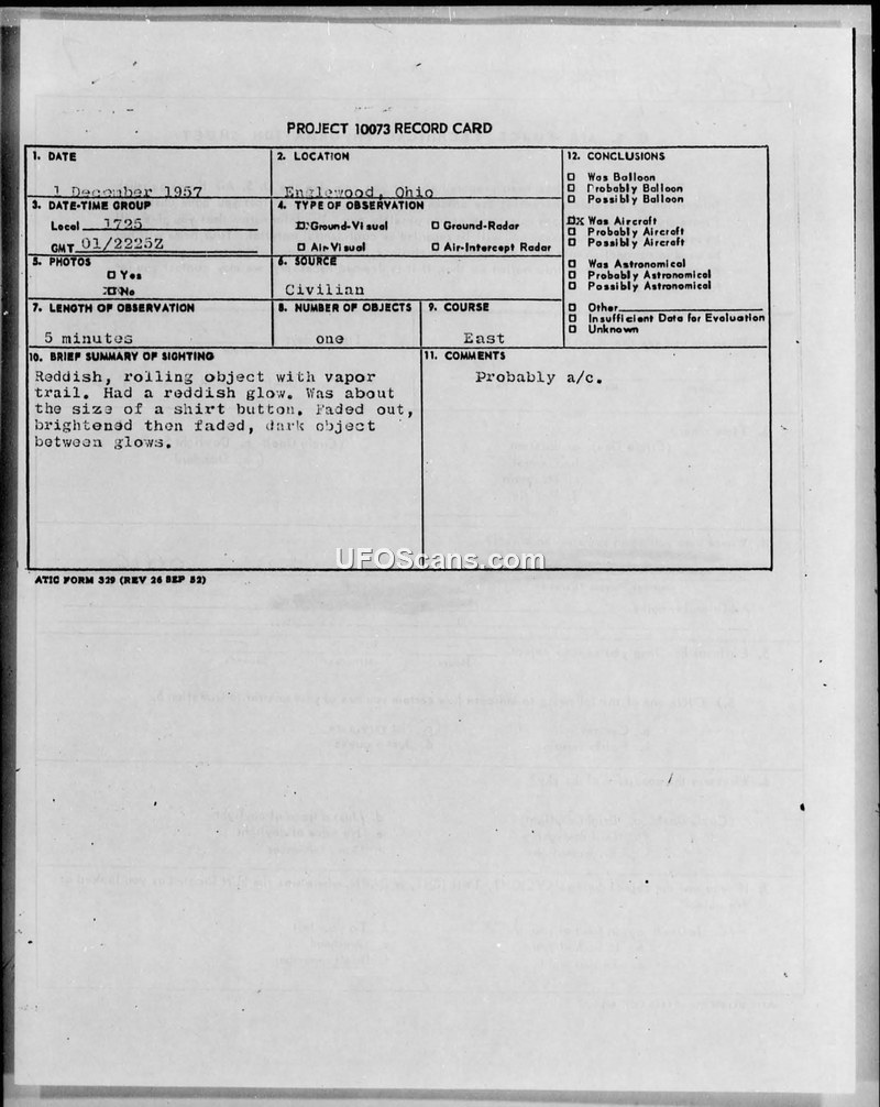 A civilian witness reported a UFO sighting in Montebello, California, in 1957 and provided 8mm film to the Air Force. ATIC investigators concluded the objects were balloons, while the witness alleged the Air Force tampered with the film.