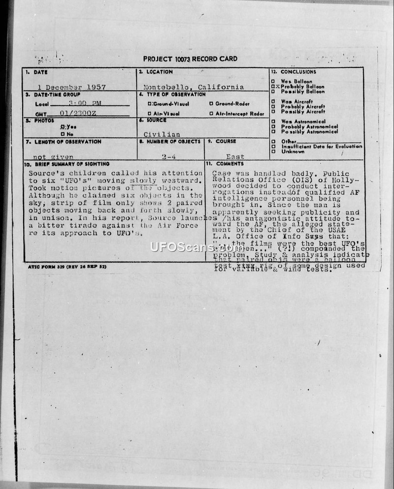 A 1957 UFO sighting in Montebello, California, was investigated by the Air Force, which concluded the objects were balloon test equipment. The report highlights significant friction between the witness and the Air Force, exacerbated by poor handling by the Hollywood Public Relations Office.