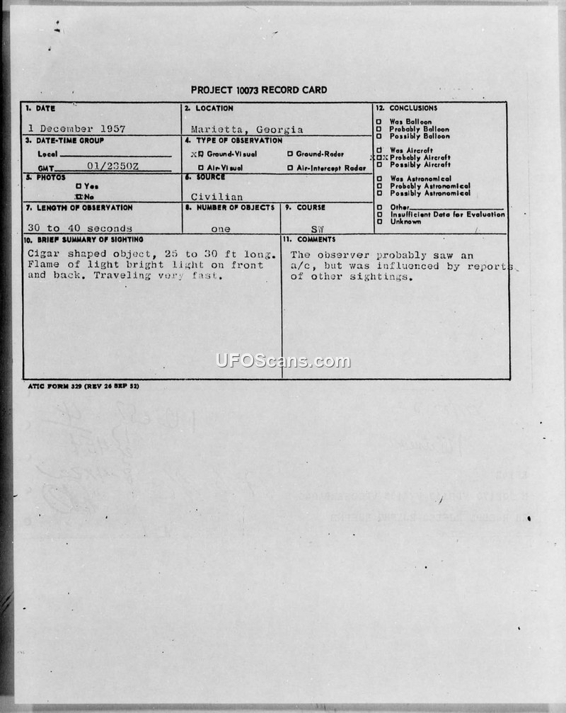 This document contains two Project 10073 record cards and associated teletype reports detailing UFO sightings near Marietta, Georgia, in December 1957. The first incident occurred on December 1, 1957, at 2350Z. The observer reported a cigar-shaped object, approximately 25 to 30 feet long, featuring bright lights on the front and back. The object was described as traveling very fast for a duration of 30 to 40 seconds. The official conclusion for this sighting was that the observer likely saw an aircraft, but their perception was influenced by contemporary reports of other sightings, specifically one in Levelland, Texas. The second incident occurred on December 24, 1957, at 0205Z. The witness, Captain B. Belton C. Evans of the 12th Weather Squadron, reported observing a round, white object the size of a baseball while traveling north in an automobile on US Highway 41, approximately four miles south of Dobbins Air Force Base. The object was observed for three seconds as it moved straight down and dropped below the horizon. The official conclusion for this second sighting was that the object was a meteor.