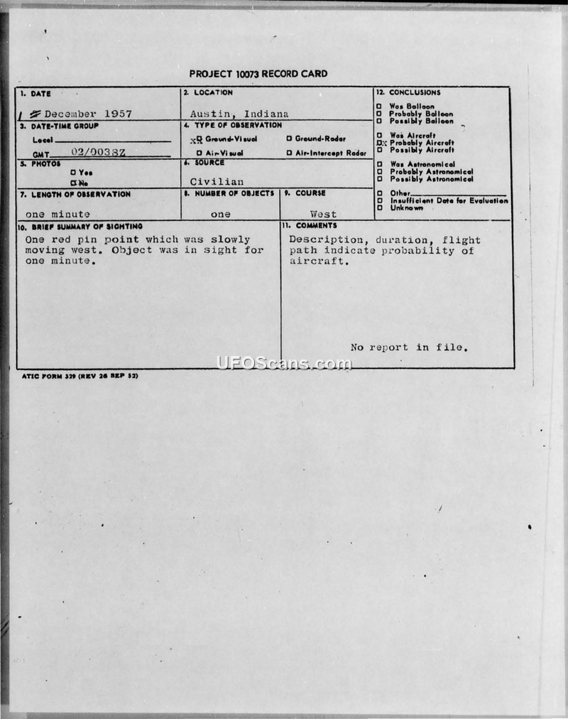 This document is a Project 10073 record card detailing a civilian sighting of an unidentified aerial phenomenon that occurred in Austin, Indiana, in December 1957. The witness reported observing a single red pin-point object moving slowly toward the west. The duration of the sighting was recorded as one minute. The observation was made via ground-visual means. The record card indicates that no photographs were taken and there was no radar contact associated with the event. The official conclusion reached by the evaluating body, the Air Technical Intelligence Center (ATIC), was that the description, duration, and flight path of the object indicated a probability that the object was an aircraft. The document notes that there is no further report on file regarding this incident.
