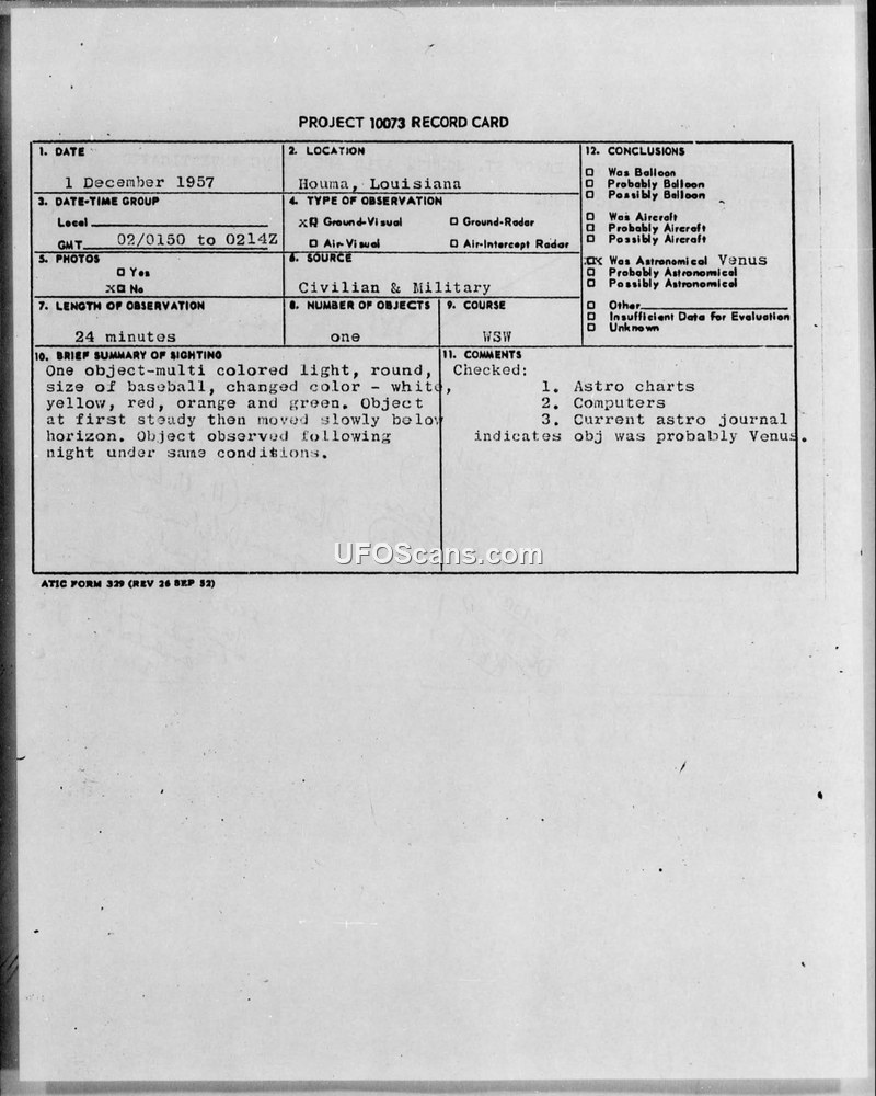 This document consists of a series of records, including a Project 10073 Record Card and an UFOB Index Card, detailing a sighting of an unidentified aerial phenomenon in Houma, Louisiana, on 1 December 1957. The sighting involved a single, round, multi-colored object described as being the size of a baseball. The object reportedly changed colors—white, yellow, red, orange, and green—and remained visible for 24 minutes. Initially, the object was observed to be steady before moving slowly below the horizon in a west-southwest direction. The report notes that the object was observed under similar conditions on the following night. Military personnel from the 657th ACWRON, including Captain Evan D. Evanoff, were involved in the investigation. The military checked with local sources, including a pilot from the Texas Oil Company, to rule out unauthorized flight activity in the area. The official conclusion reached by the Air Technical Intelligence Center, based on the use of astro charts, computers, and current astronomical journals, was that the object was the planet Venus. The document also contains internal military communications, including a teletype message regarding the investigation and a note indicating that the observer had seen the light three times in the same area, with the light appearing brighter and higher in the sky on the subsequent night.