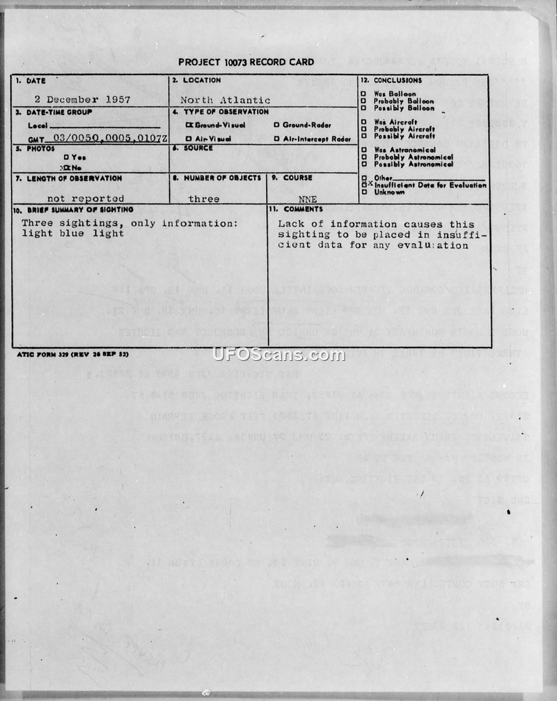 PROJECT 10073 RECORD CARD — North Atlantic Sighting, 2 December 1957