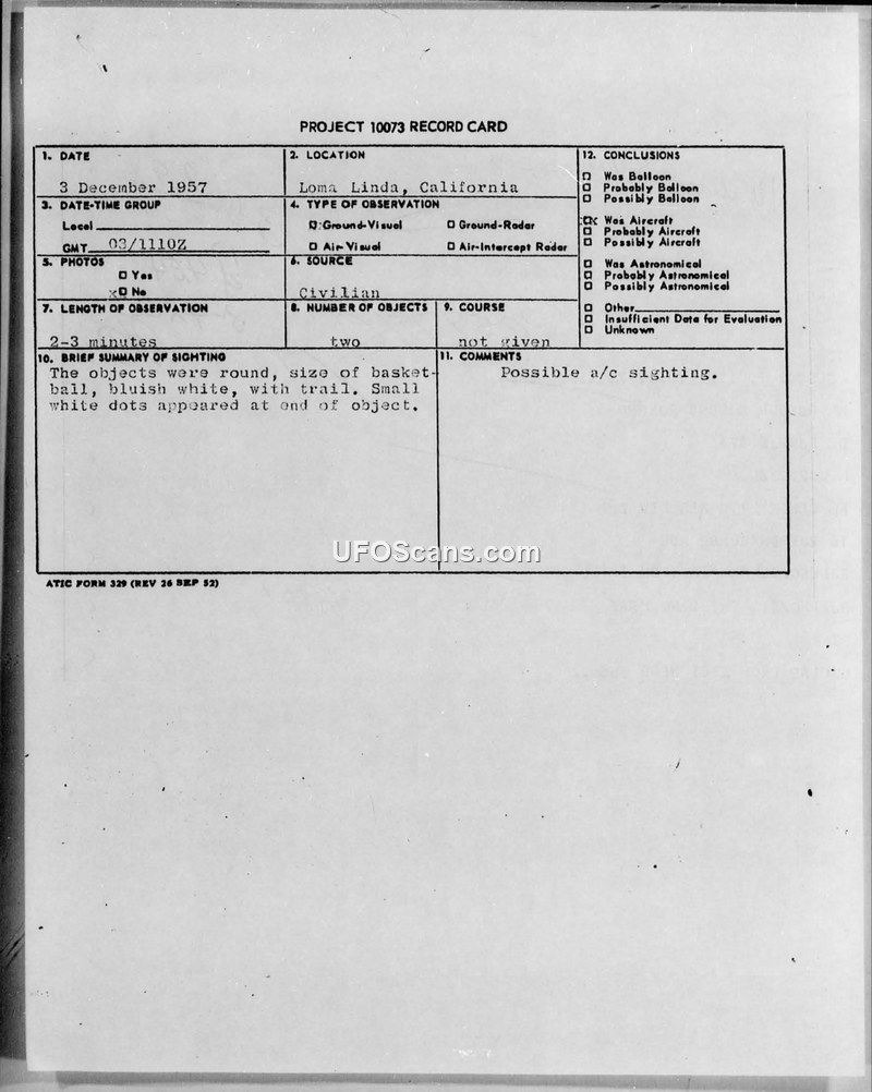 Project 10073 Record Card — Loma Linda, California, 3 December 1957
