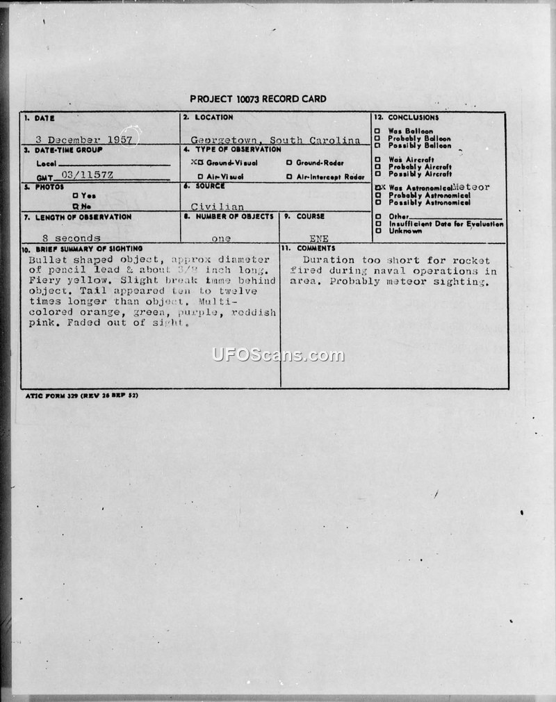 On December 3, 1957, a civilian observer near Georgetown, South Carolina, reported a sighting of an unidentified aerial object. The witness, who was duck hunting at the time, described the object as bullet-shaped, approximately the diameter of a pencil lead and 3/8 of an inch long. The object was described as fiery yellow with a tail ten to twelve times its length, displaying colors of orange, green, purple, and reddish pink. The object followed a smooth arc in an ENE direction before fading out of sight after approximately eight seconds. The observer was noted to be a mature, level-headed individual. Military intelligence investigated the report, noting that U.S. Navy operations were occurring in the vicinity of warning area W-177. While it was suggested that the observer might have been disoriented and looking south instead of north, the report concludes that the duration of the event was too short for a rocket firing, and it was likely a meteor sighting. The report was processed by the 354th Fighter Day Wing and forwarded to the Air Technical Intelligence Center (ATIC) at Wright-Patterson Air Force Base. ATIC subsequently advised that no further report was desired.