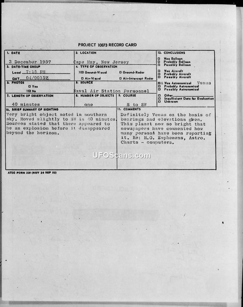 A sighting of a bright object by Naval Air Station personnel in Cape May, New Jersey, on December 3, 1957, was officially identified as the planet Venus.