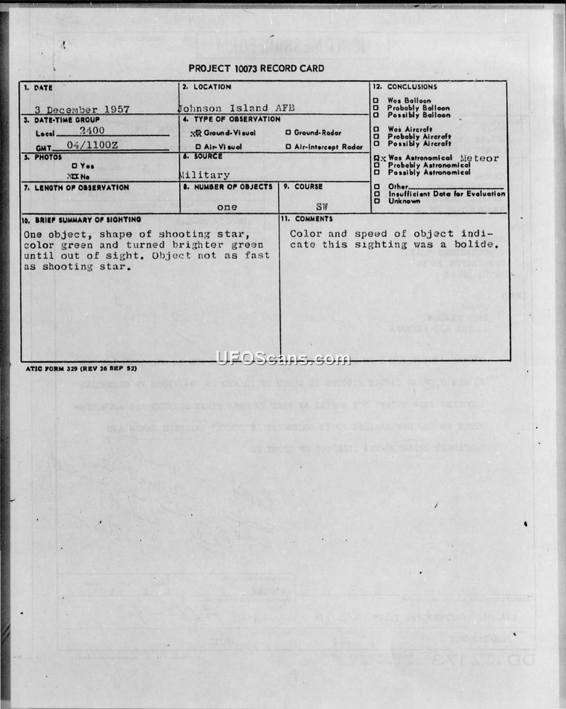 A sighting of a green object over Johnston Island on December 3, 1957, was officially identified as a bolide (meteor) by the Air Technical Intelligence Center.