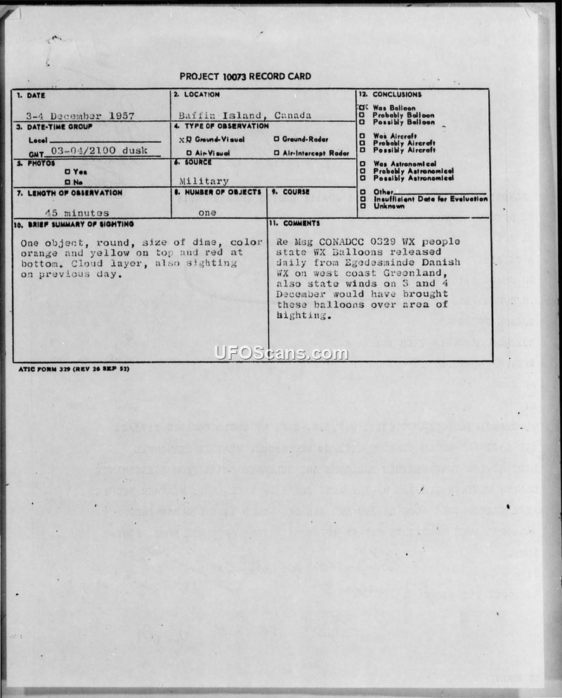 Military personnel in Baffin Island reported a round, multi-colored object in December 1957. The 64th CONADCC concluded the sightings were likely weather balloons released from Greenland.