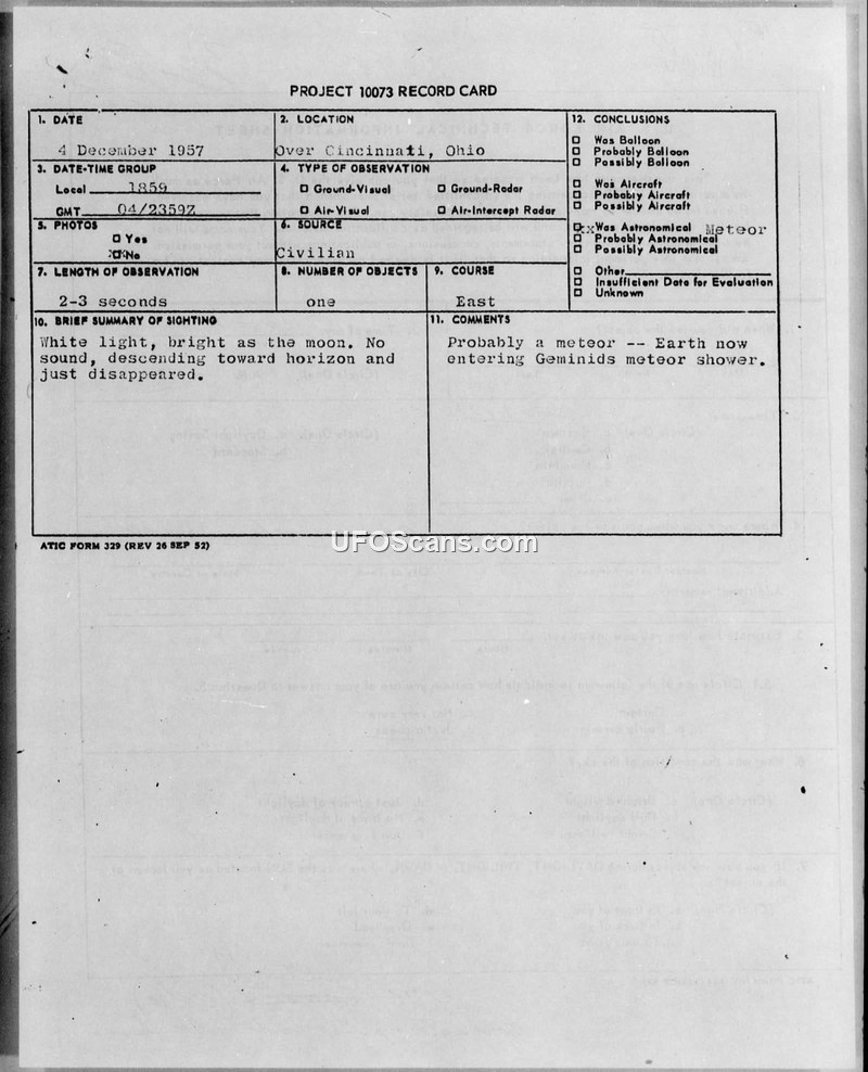 Project 10073 Record Card — Cincinnati, Ohio, 4 December 1957