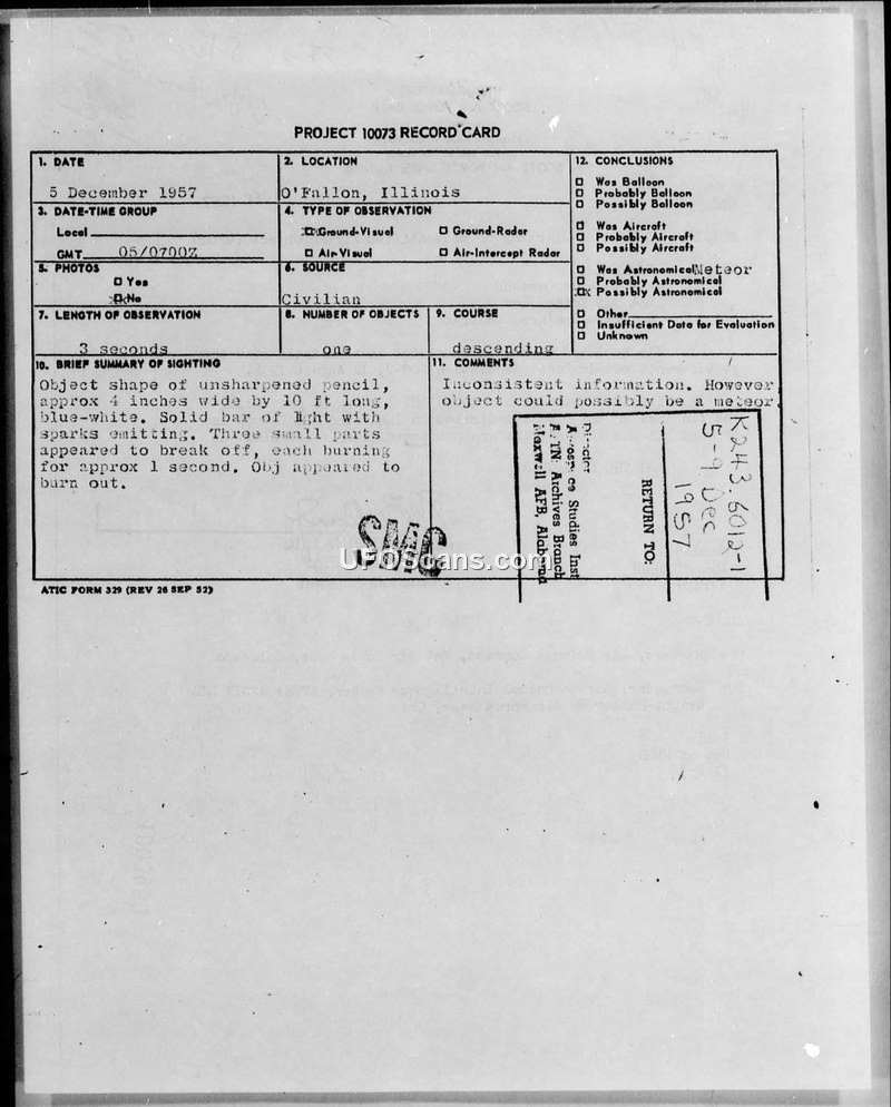 A report of a blue-white, pencil-shaped object observed descending vertically over O'Fallon, Illinois, on 5 December 1957. Military authorities concluded the sighting was inconsistent and potentially a meteor.