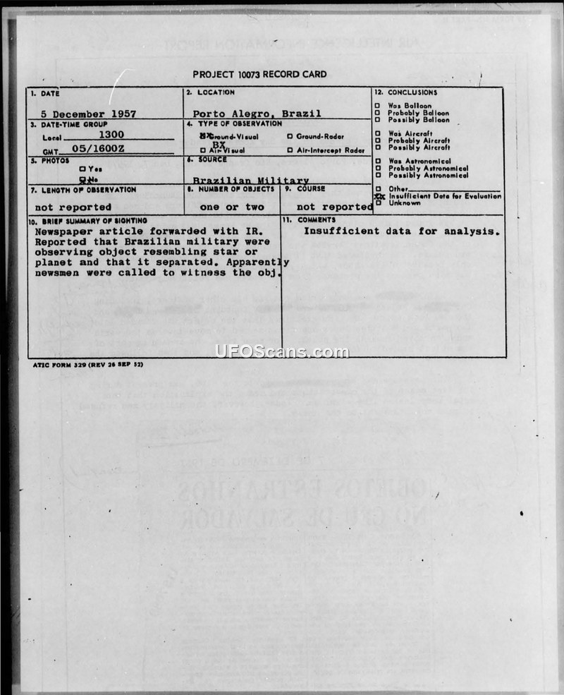 Project 10073 Record Card: Porto Alegre, Brazil, 5 December 1957