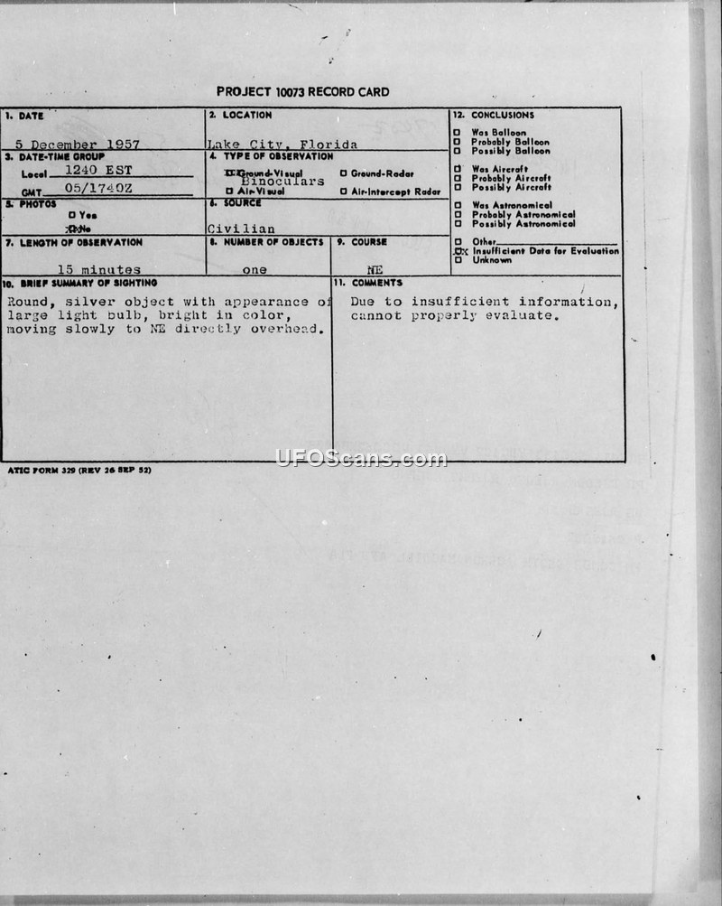 Project 10073 Record Cards and Related Correspondence — Lake City, Florida, 5 December 1957