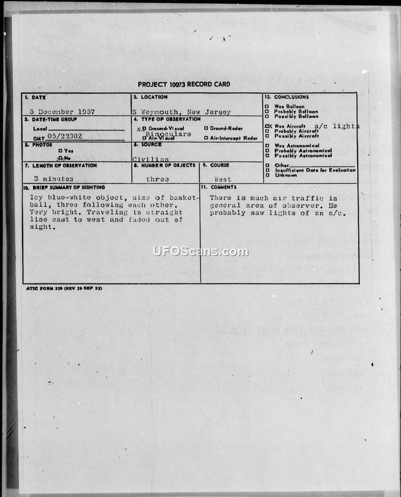 Project 10073 Record Card — South Weymouth, New Jersey, 5 December 1957