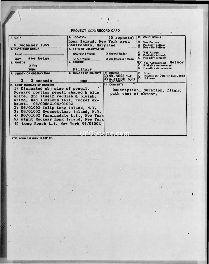 This document is a collection of reports and record cards compiled under Project 10073 regarding a series of sightings in the Long Island, New York area on December 5, 1957. Multiple witnesses reported observing a bright, elongated object in the night sky, characterized by a blue-white color, a luminous tail, and a swishing sound. The sightings occurred between 0058Z and 0100Z. Witnesses described the object as moving very fast, with some noting a trajectory from northwest to southeast or west to east, and others describing it as moving straight down toward the horizon. The duration of the sightings was consistently reported as very brief, typically lasting between two and five seconds. The reports were processed by various military units, including the 26th Air Division and the 85th Air Division, and forwarded to the Air Technical Intelligence Center (ATIC) and the Director of Intelligence at HQ USAF. The official evaluation across these reports consistently identifies the phenomenon as a meteor or shooting star. Investigators noted that the descriptions, including the duration and flight path, were characteristic of a meteorite. Regarding the reported 'swishing sound,' one investigator suggested it might have been attributed to the over-exertion of the observer, who was reportedly shoveling snow at the time of the sighting. Another note suggests the possibility of a partially inflated balloon, though the meteor conclusion remains the primary assessment. The document includes various teletype messages (MTL 057-12, OIN 12830, 12831, 12832, 12861) documenting the individual reports from different locations on Long Island, such as Islip, Syosset, Farmingdale, Rockway, and Long Beach. The reports were handled in accordance with Air Force Regulation 200-2, which governed the reporting of Unidentified Flying Objects (UFOBs). Despite the varied descriptions—ranging from 'pencil-shaped' to 'delta-shaped' or 'basketball-sized'—the consensus among the military evaluators was that the sightings were astronomical in nature.
