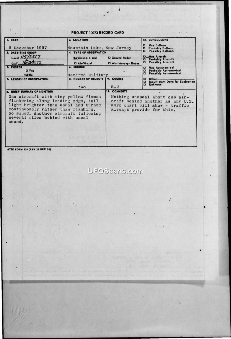 Project 10073 Record Card — Mountain Lake, New Jersey, 5 December 1957