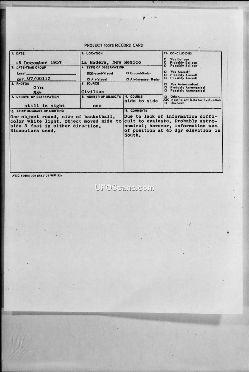 A civilian in La Madera, New Mexico, reported a round, white, basketball-sized object moving side-to-side on December 6, 1957. The military investigation concluded there was insufficient data to identify the object, though it was tentatively labeled as likely astronomical.